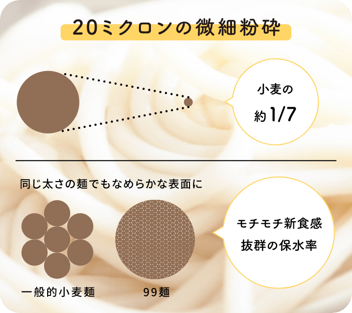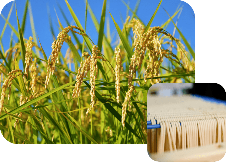 グルテンフリー、ヴィーガン、ダイエット、アレルギーなど、食環境も多様化する中で、同じメニューをおいしく楽しめる食材として、日本の米のチカラで健康を世界に届けるべく、【99麺】は誕生しました。その秘密は、非加熱の特殊技術により玄米を養分までまるごと20ミクロンという煙と同等の細かさにまで製粉した玄米全粒粉。その粒子のサイズと形状により1%以下の自然由来のつなぎだけで製麺できるため、基本の原料は玄米のみで、28品目の特定アレルゲンも不使用。ノンケミカルの殺菌技術も駆使した安全な製法で作られたノングルテン玄米麺が【99麺】です。
