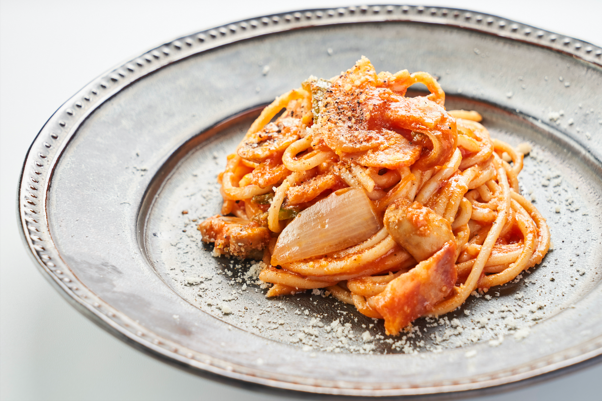 - 茹で上がった99麺をソースと絡め、パルミジャーノパウダーとエクストラヴァージンオリーブオイルを仕上げに絡める。