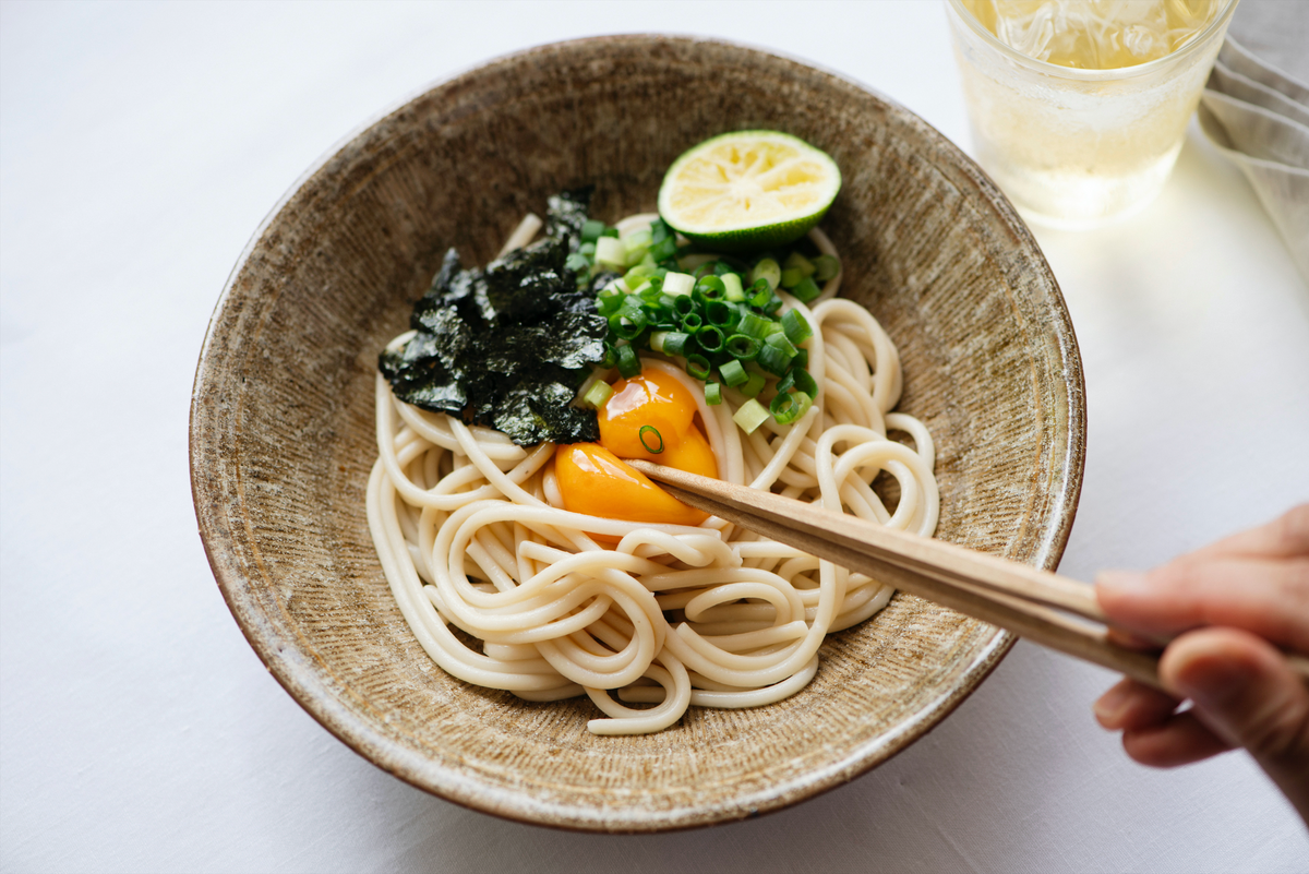 - 麺のゆで汁をきって器に盛り、卵黄をのせる。のりをちぎってのせ、万能ねぎを添え、しょうゆをたらす。すだちを搾って食べる。
