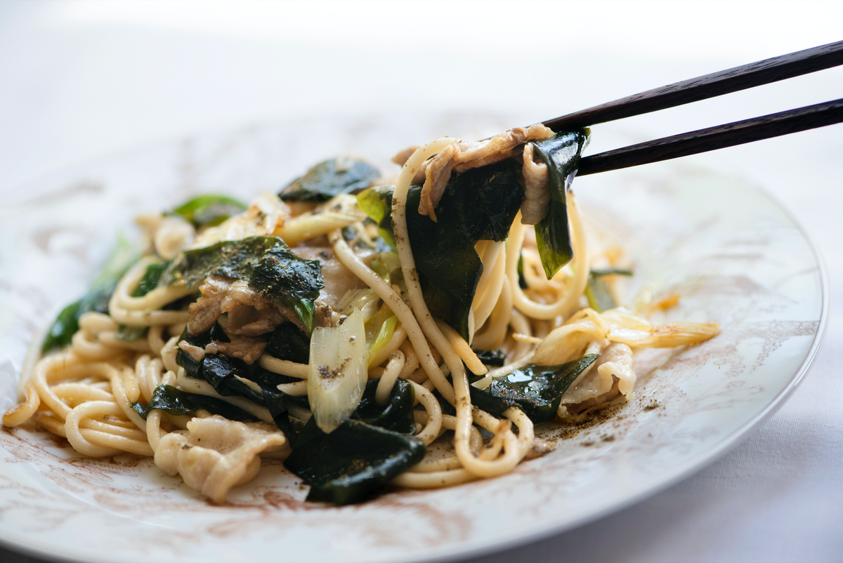 ねぎとしょうがの香りが食欲をそそる、豚肉とわかめのさっと炒めにゆでたて99麺をほうり込んでチャチャッと