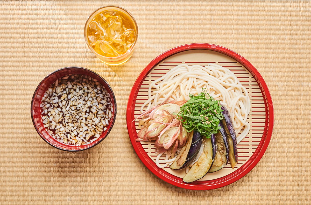 - 茄子と茗荷、大葉を麺の上に盛り付け、白胡麻をかけて完成。
